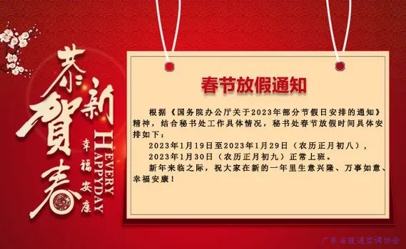 新春伊始,萬象更新。廣東省暖通空調協會秘書處全體員工在此深深感謝各會員單位一直以來對秘書處工作的支持與厚愛!向您致以最誠摯的祝福和問候!根據《國務院辦公廳關于2023年部分節假日安排的通知》精神,結合秘書處工作具體情況,秘書處春節放假時間具體安排如下:春節放假時間:2023年1月19日至2023年1月29日(農歷正月初八)。2023年1月30日(農歷正月初九)正常上班。 新年來臨之際,秘書處全體員工在此祝大家在新的一年里生意興隆、萬事如意、幸福安康!